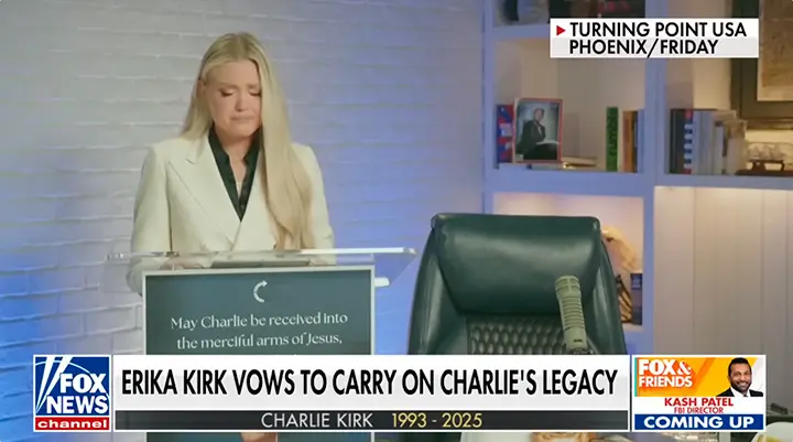 Charlie Kirk's widow vowed to continue his conservative activism, ensuring Turning Point USA's fall campus tour and December AmericaFest conference proceed. She declared that the assassins, who silenced his message of patriotism, faith, and God’s love, have unknowingly unleashed a greater movement by killing a martyr. Her cries, she said, will echo worldwide as a battle cry, amplifying his mission.